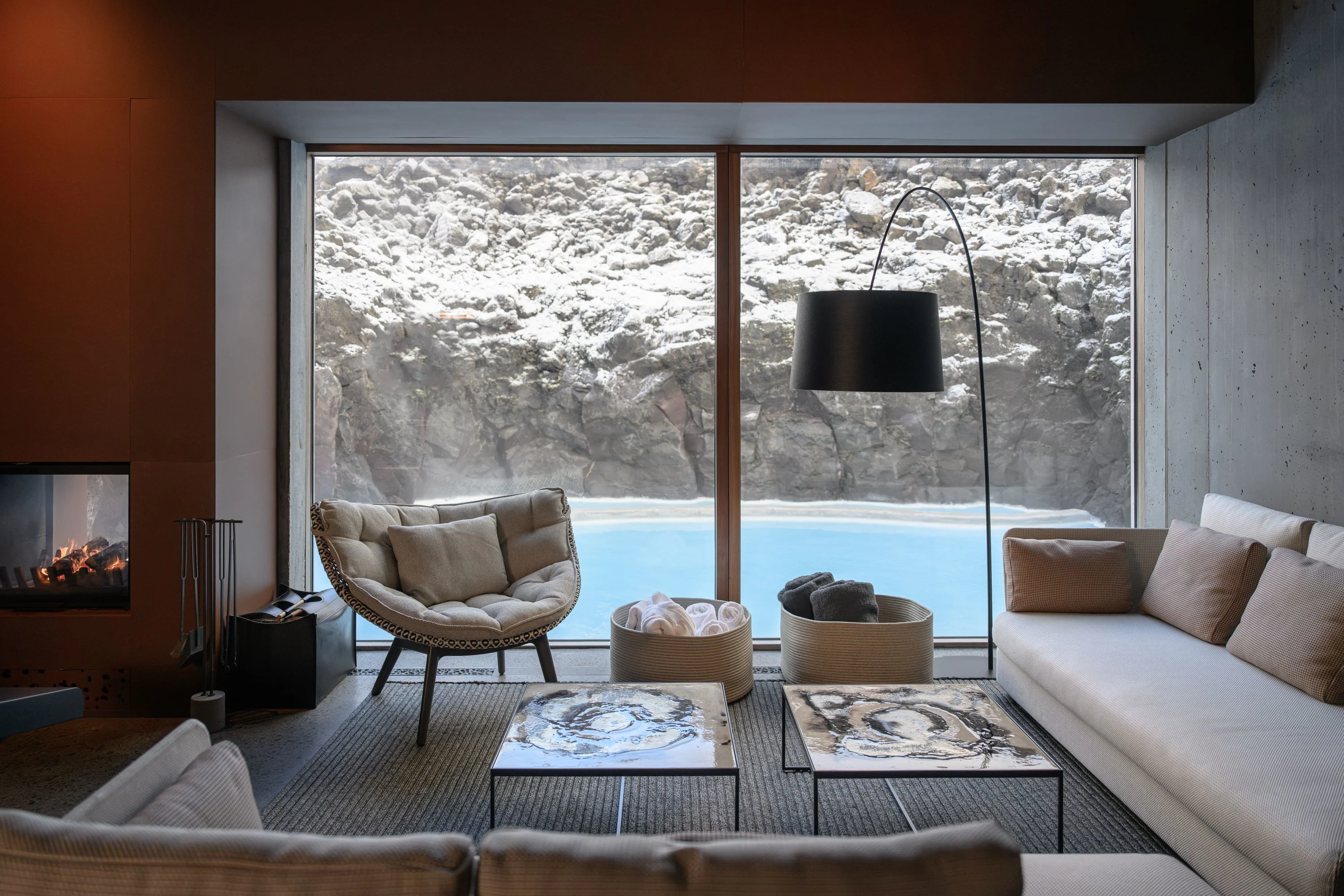 The suite includes a private lagoon, comfortable seating, and a fireplace. The suite itself is 42 m2 and the lagoon is 28 m2 of warm, inviting, and restorative water. With a welcome drink, minibar, fresh fruit, handcrafted chocolates, blankets, pillows, and a Bluetooth sound system, you can spend a day lounging in complete privacy.