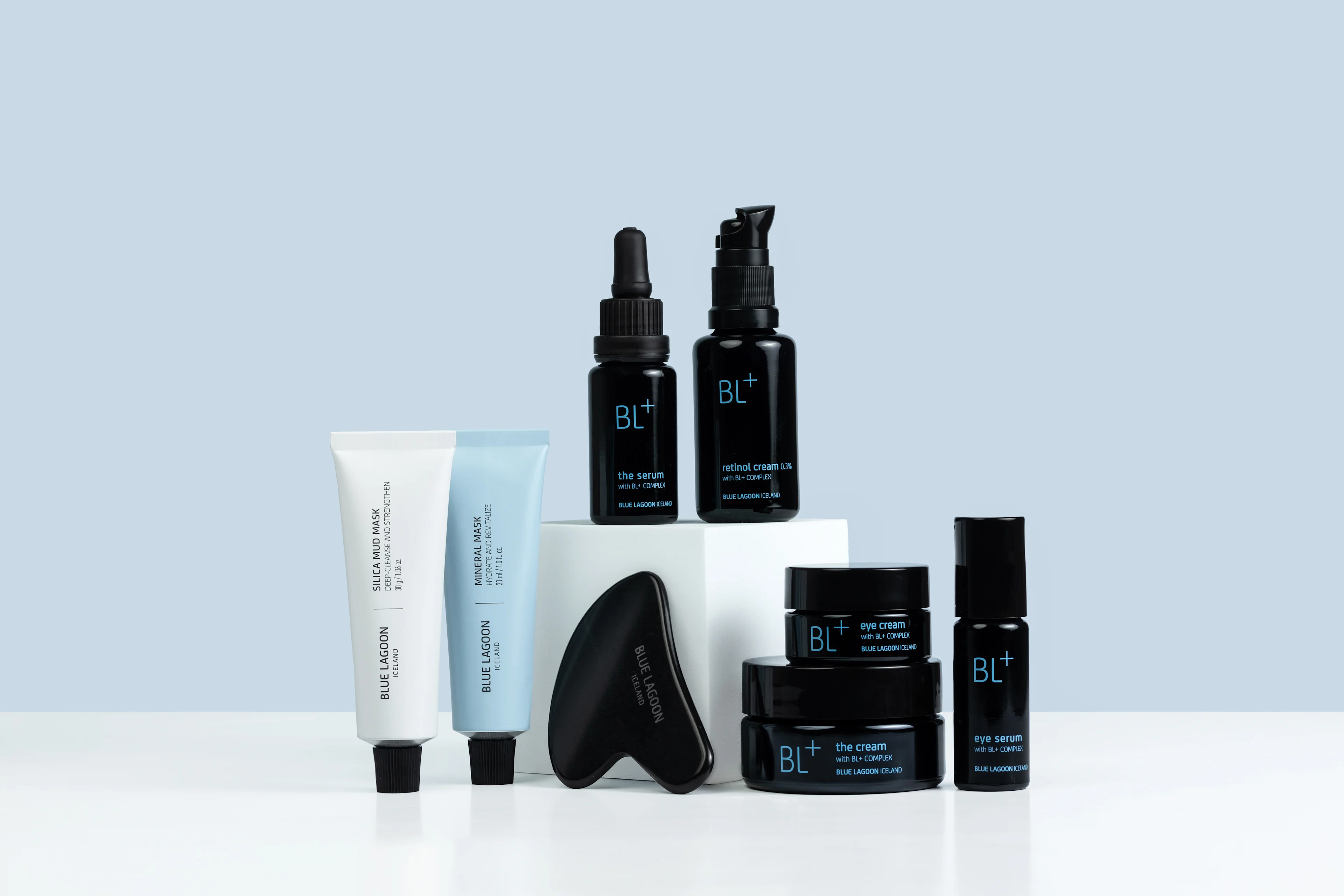 The set contains: BL+ Retinol Cream 0.3% (30 ml), BL+ The Serum (15 ml), BL+ The Cream (50 ml), BL+ Eye Serum (10 ml), BL+ Eye Cream (15 ml), Mineral Mask (30 ml), Silica Mud Mask (30 ml), and a Blue Lagoon Skincare Gua Sha.